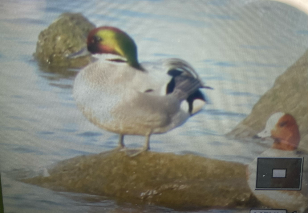 Zit nu hier, bij het (nu drooggevallen) meeuweneiland. Tussen 46 Krakeenden en ruim 100 Smienten. Is zich nu al 9 min aan het poetsen en heb door de zoeker van mijn videocamera geen ringen of gaten in vleugels kunnen vaststellen.